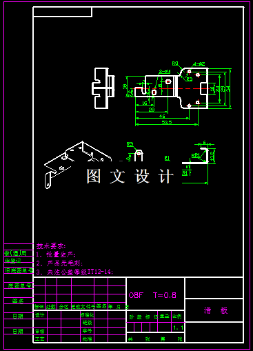 产品所用的材料为08F,其力学性能如下:τ=220~310Mpa,σb=280~390 Mpa, σs=180Mpa。(《冷冲压工艺与模具设计》P322),零件图上未注公差等级,属自由尺寸,按IT12级确定工件尺寸的公差.该制件形状简单,尺寸较小,厚度一般,属于普通冲压件,