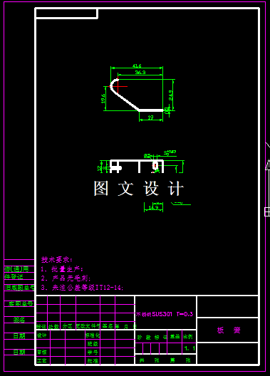 本零件采用的是0.3mm的不锈钢料带冲压而成,由图而知该图的零件外形尺寸不大但是外形复杂,要求的精度也不高。所以一次冲裁很难完成。该零件有一个Ф3mm,一个Ф3.6mm和一个5x3孔。还有一个槽。由于两个孔和方形孔的直径大于料厚所以不属于深孔冲裁,故没有必要对小孔模采取保护措施,所以对凸模不需要进行强度校核。从材料来说,该零件比较薄,便于成型,故该零件有利于冲压成型。