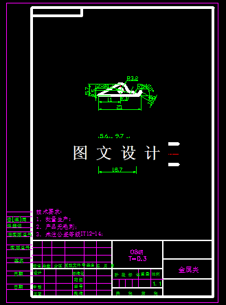 该产品落料,冲孔,弯曲等工序结合,结构较为简单,整个形状由直线与圆弧组成。由零件图可知,该件的经济精度为IT14,符合冲裁精度要求,精度要求能够在冲裁加工中得到保证,一次冲压成形。其尺寸要求、生产批量等情况,也均符合冲裁的工艺要求。 材料为08F。该工件的弯曲内圆角半径为0.5mm,大于最小弯曲半径rmin=0.4t=0.4×0.3=0.12mm,故该工件形状、尺寸、精度均满足弯曲工艺的要求,可以采用弯曲工序加工。