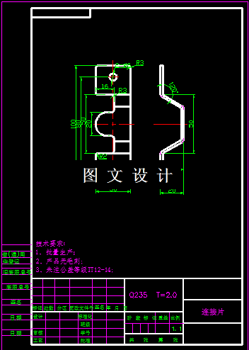 该件为带圆孔的方形零件,尺寸精度要求不高,由冲裁和弯曲即可成形。冲压难点在于多道工序在一副模具里实现,即采用连续冲压的方法,同时要保证产品不能变形。同时为模具收力均匀,最后切断的方法,这样既能提高生产效率,有能使模具稳定,沿长模具寿命。