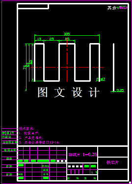 本设计对铁芯片进行的级进模设计,利用Auto CAD软件对制件进行设计绘图。明确了设计思路,确定了冲压成型工艺过程并对各个具体部分进行了详细的计算和校核。如此设计出的结构可确保模具工作运用可靠,保证了与其他部件的配合。并绘制了模具的装配图和零件图。 本课题通过对铁心片的冲压模具设计,巩固和深化了所学知识,取得了比较满意的效果,达到了预期的设计意图。