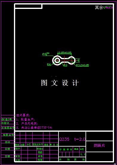 防转片所用的材料为Q235,其力学性能如下:τ=260~320Mpa,σb=320~400 Mpa, σs=200Mpa。(《冷冲压工艺与模具设计》P322),零件图上未注公差等级,属自由尺寸,按IT12级确定工件尺寸的公差.该制件形状简单,尺寸较小,厚度一般,属于普通冲压件,