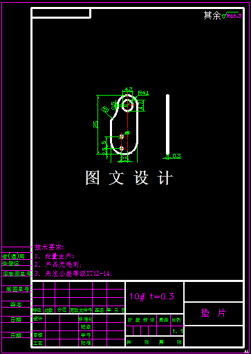 设计中的冲压制件是一垫片。由制件零件图可以知道:制件的外形不规则,尺寸很小,需要经过多次冲裁才能完成加工。通过对零件的初步分析可知,要完成该制件的生产,需要经过以下工艺:冲孔、冲孔、落料,等工艺。冲压件的精度要求较高,制件的厚度为0.3mm,属于薄材料类冲裁,选用用卷料;冲压件的材料是10#钢,是普通的优质碳素结构钢。另外,在设计中还应该考虑到产品材料的冲裁工艺性,以及其纤维方向的特性。