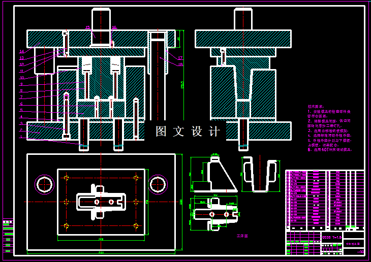 由于是中批量生产,单工序模具成本低,工序多,周转也困难,而且此形状又不适合于级进模,过测量和计算,孔边到外形的最小距离是10.9mm,而材料厚度为1.5,所以此边到边的距离应超过1.5t=2.25才能一起冲,所以符合复合模设计原理,经过以上分析,最终确定只能选择三副模具,虽然工序多,周转困难,但符合设计要求和原理。 产品材料为Q235钢,属于普通碳素钢,厚度也属于一般的冷轧碳素钢薄板及钢带,抗剪强度310-380MPa,抗拉强度380-470MPa。709034