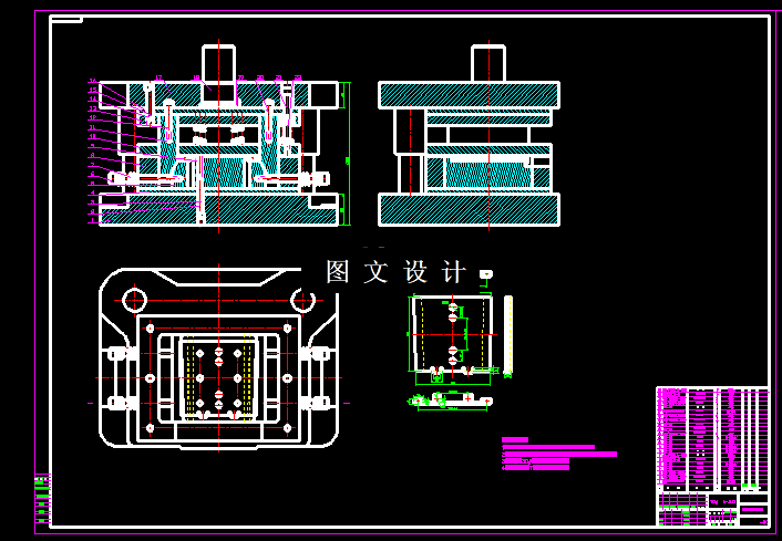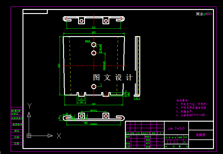 从以上结构上看,模具结构相对复杂,加工和维修也困难,模具结构复杂就容易出错误,比如加工的误差积累,会导致一些不该出现的问题出现,虽然成本低了,但前期投入的时间和精力也不少,如果采用普通的弯曲模,虽然模具成本高了点,但模具加工方便,维修方便,模具结构简单,从模具成本的角度出发,两幅简单的弯曲模的成本比一副复杂的弯曲模的成本高不了多少,仅仅多了一个冲次,产品的成本高了一些,本次设计结合实际设计能力,考虑采用普通的弯曲模,即落料冲孔,弯曲1,弯曲2,3副模具。