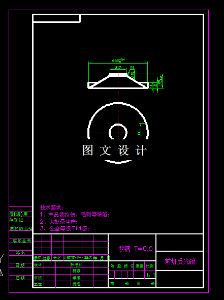 此制件的形状为圆形,其中工序有拉伸,冲孔,翻孔,翻边等,且对称,有圆角过渡,便于模具的加工和减少冲压时在尖角处开裂的现象,同时也可以防止尖角部位刃口的过快磨损。本次设计有落料,拉伸,切边,冲孔,翻孔等多道工序,考虑到模具成本,多次定位,尺寸不稳定等因素,这里考虑多次工序复合的方法来实现,根据实际情况,本课题产品使用落料拉深,切边冲孔,翻边翻孔复合模,三道工序,三套模具。
