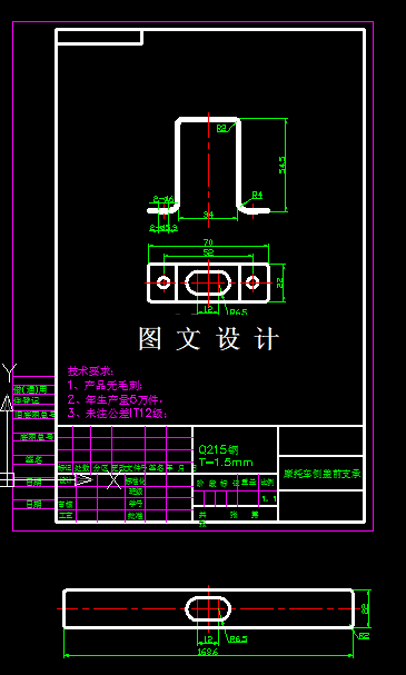 该零件弯曲件形状简单,适用模具批量生产,零件材料Q215钢,属于一种碳素钢,厚度t=1.5mm,该产品四角为R2,这样可以防止尖角部位刃口的过快磨损,要保证弯曲内尺寸34,以及底面的腰孔不变形,这个就要控制产品弯曲的回弹,这个会在后期设计模具和计算时具体计算和分析。