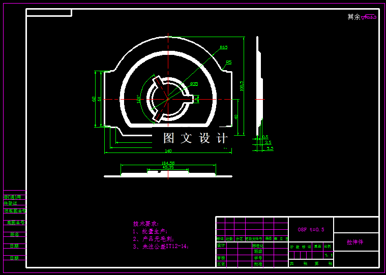 本零件采用的是0.5mm的钢带冲压而成,由图而知该图的零件外形尺寸不大但是外形复杂,拉伸高度只有5mm,相对拉伸部分形状尺寸来说,属于浅拉伸,要求的精度也不高。所以可以按浅拉伸设计计算,拉伸过程中,产品外形不变,所以从形状上看,该产品需要两副模具冲压,从材料来说,该零件比较薄,便于成型,故该零件有利于冲压成型。703972