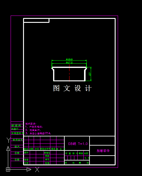 根据工件相对高度h/d=27/61=0.4426,查表的修边余量为1.5,所以切边之前的拉深高度为27+1.5=28.5,展开尺寸计算产品拉深高度按28.5计算。 此拉深零件产品底部比口部大,所以只能通过反墩工艺实现,所以在镦压之前,拉深零件的高度必须要超过产品所需要的高度,才能有材料,有空间让他镦压,所以根据工艺分析及侧面长度尺寸的计算,镦压之前的拉深高度尺寸为39.1,拉深,镦压之后,通过机加工,达到切边工序,保证零件高度27。