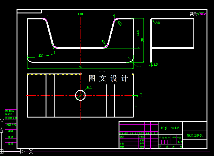 横梁连接板厚度为1.5mm,因为成型横梁连接板需要经过落料、冲孔、翻边、弯曲,才能最后实现产品型,由于产品形状简单,但是翻边高度高,而且翻边形状不规则,展开尺寸需要根据实际弯曲模具,翻边模具的间隙和结构来调试,计算结果仅仅作为参考。 根据产品中性层不变原理计算展开尺寸,形状不规则的需要结合生产调模经验得画出示意图,然后根据此图形不断的调试,最后得出最终的合格产品。 该产品分三道工序,而落料冲孔模,是第一道工序,计算展开尺寸就要从后往前推算,本次设计要先计算出弯曲工序图,然后通过此图在计算出落料工序图。