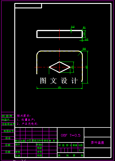 本次设计如上图,拉深高度低,且四周有R角过渡,形状较简单,且对称,便于模具的加工,产品四周拉伸完之后还需要进行卷边,方便与茶叶盒配合,无毛边,不刮手,所以产品拉深好之后需要采用后续卷边等工序完成最后的成品,本次设计只需要考虑卷边之前的工序,拉伸高度达到13mm即可,所选材料为08F钢,属于优质碳素结构钢,其抗拉强度为300-360MPa,抗剪强度为260-310MPa,屈服极限180MPa,延伸率20%,适合做拉深件。