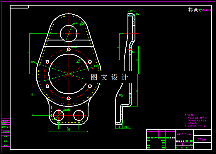 该零件为不规则形状浅拉伸,无法详细按圆筒形拉伸公式计算,本来可以认为直边部分知识简单弯曲变形,而圆角部分只发生拉伸变形,按圆筒形拉伸展开,再用光滑曲线进行修正即可得出展开毛坯图,由于此课题图形,圆角部分R角大,切不规则,材料厚度很厚,无法按正常公式计算,所以粗略还是按弯曲变形计算,后期按实际模具间隙和模具结构调整此尺寸。