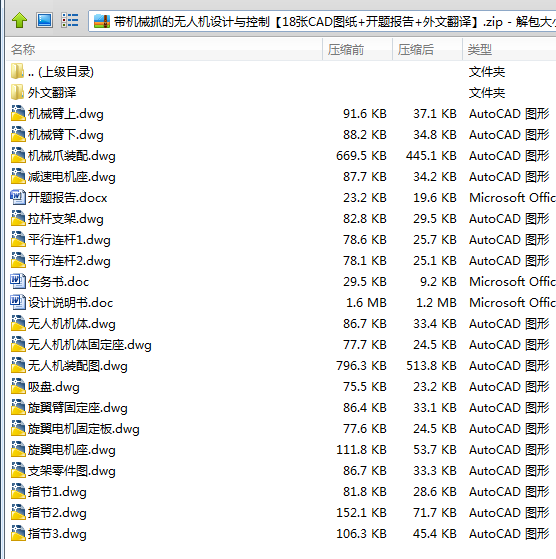 从90年代第一架微型无人机问世以来,微型无人机经历了20几年的快速发展,微型无人机在航拍、农业植保、测绘、运输、军事侦查等领域的得到了广泛的应用,大大的拓展了无人机本身的用途。近年来无人机快递更是在新闻媒体上屡屡现身,微型无人机的负载从开始的几十克发展到现在的几千克,其运输能力获得了几十倍的增长。得益于无人机的快速发展,本文设计了一种带机械爪的四旋翼无人机,其机械爪具有两个自由度(张夹和摆动),通过无人机的偏航运动,实现机械爪的第三个自由度(旋转)。本文设计的机械手爪由单电机驱动具有两根手指和6个指节。该手爪由电机驱动一根拉杆支架,其端部分别连接第一指节的动力杆;每个手指有3个指节,第一指节与第二指节与平行四边形连杆连接,确保第三指节做平移运动;每个手指第二指节具有延伸的圆弧滑槽,当第指节支点随第一指节运动时,经过特别设计的圆弧滑槽在固定支点滑动,可使第三指节的运动速度与电机转速程线性比例关系运动。该机械爪能够对液体和泥沙进行取样,并且能抓取方形,圆柱形,球体及不规则形状的物体。最大抓取重量为500g,抓取物体最大尺寸100mm左右。第三指节的夹紧力在夹紧过程中逐渐减小,有利于夹持易碎易变形的物体。机械爪通过减震柔性机构与无人机连接,保证机械爪在夹持物体时无人机能够自主悬停,稳定的夹持重物。无人机配备导航模块,可在夹持任务完成时自主返回,大大减少操控者的工作强度。本文设计的无人机可用于危险环境中的样品采集、侦查和小件物品的递送,大大扩展了无人机本身的用途。