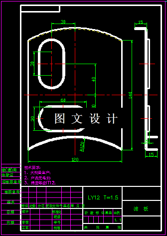 此制件为支架,其形状较简单,为Z形上下弯曲的零件,且对称,为方便模具的加工,减少冲压时在尖角处开裂的现象,所以展开后尖角处需要增加过渡R角,根据产品材料厚度1.5mm,选择过渡R角为R1,所选材料为LY12,此材料为硬铝。力学性能:抗拉强度为150-215MPa,抗剪强度为105-150MPa,具有较好的冲裁性能。