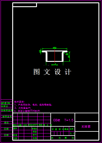 此制件的形状较简单,且对称,有圆角过渡,便于模具的加工和减少冲压时在尖角处开裂的现象,同时也可以防止尖角部位刃口的过快磨损。所使用的材料为08钢,其抗拉强度为330-450MPa,抗剪强度为260-360MPa,屈服点200MPa。 本次产品共有落料、拉伸、冲孔、翻孔等工序,结合计算和工序的合理安排,本次设计,只需要设计其中两副单工序模具,落料拉伸复合,冲孔翻孔复合,两幅复合模。具体工艺计算见下章。本次设计只设计其中的冲孔翻孔模。