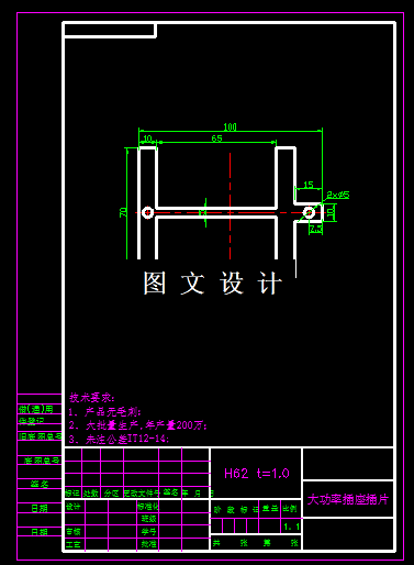 本设计通过对大功率插座插片的复合模设计的工艺性分析,确定了正确的工艺方案。从而对模具设计方案,以及冲压设备作出了分析与选择。通过分析决定采用复合模形式,然后参考其他模具结构以及查手册和计算设计。当所有的参数计算完后,对模具的装配方案,对主要零件的设计和装配要求技术要求都进行了分析。在设计过程中除了设计说明外,还包括模具的装配图,非标准零件的零件图等。