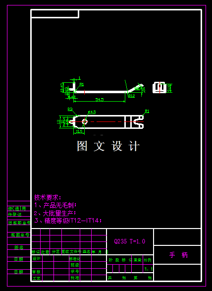 手柄,通过分析制件的工艺性可确定制件的成形加工需要二副模具完成。为减少工作量,只设计落料冲孔复合模。复合模是指冲床在一次行程中,完成落料、冲孔等多个工序的一种模具结构。相对其他冷冲压模具结构而言,它具有以下一些优点:①工件同轴度较好,表面平直,尺寸精度较高; ②效率高,受条料外形尺寸的精度限制较小。但需考虑的问题是:模具零部件加工制造比较困难,成本较高,并且凸凹模容易受到最小壁厚的限制。