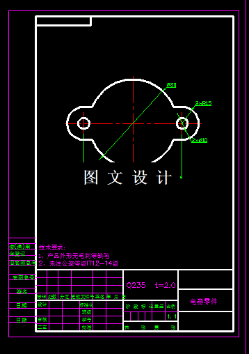 产品所用的材料为Q235钢,属于普通碳素钢,其力学性能如下:τ=310-380Mpa,σb=380-470Mpa,(《冷冲压工艺与模具设计》P322),零件图上未注公差等级,属自由尺寸,按IT14级确定工件尺寸的公差.该制件形状简单,外形尺寸较小,孔到边的距离为15-5=10mm,远大于两倍的材料厚度,根据资料可查,大于等于材料厚度的1.5倍既可以采用复合模,本次设计从产品尺寸来看,设计复合模或者级进模,均可以。