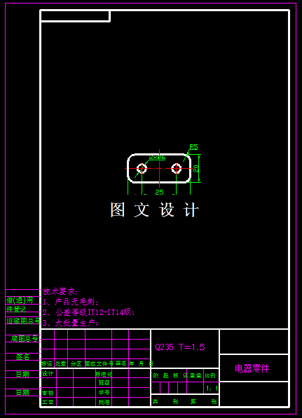 本次设计主要由绪论、零件的成型工艺分析、工艺方案制定、及设计计算、模具结构零部件的设计计算,模具缺陷分析等五大部分构成。论文主要围绕该零件冲压成形工艺及模具设计展开,综合运用冲压成形工艺及模具设计理论以及AUTOCAD等辅助设计软件,完成设计计算,并绘制模具的装配图和零件图。