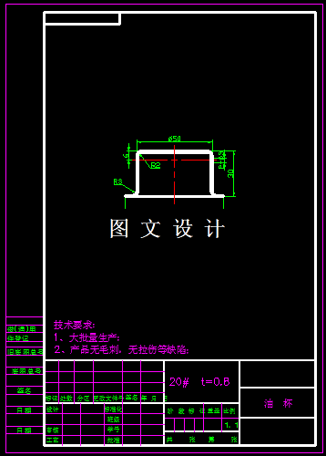 此制件的形状较简单,且对称,有圆角过渡,便于模具的加工和减少冲压时在尖角处开裂的现象,同时也可以防止尖角部位刃口的过快磨损。整个产品属于拉伸零件,侧面有两个3毫米的孔,如何保证两个孔同心,这个将是本次设计的重点和难点。