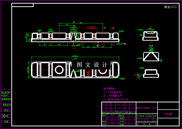 此制件的形状较简单,就两个盒形拉深,中心距离有要求,另外,外形很人性化的设计,圆弧带翻边,产品必须要无毛刺,否则刮手,产品对称,有圆角过渡,便于模具的加工和减少冲压时在尖角处开裂的现象,同时也可以防止尖角部位刃口的过快磨损。