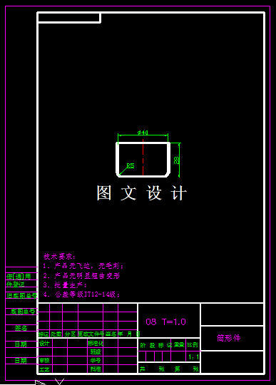 圆筒盖拉伸件冲压模具设计,包括落料模,拉伸模,两套装配图,零件图,设计计算。 拉深件形状简单,适用模具批量生产,零件材料08钢,厚度t=1.0mm,产品材料性能分析如下: 材料材质:08钢 抗剪强度:260-360Mpa 抗拉强度:330-450Mpa 屈服极限:200Mpa 延伸率: 32% 531767