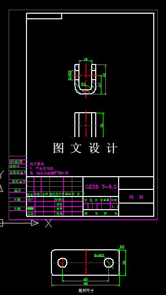 U形托架落料冲孔,弯曲模具设计,包括装配图,零件图,设计计算。 便于模具的加工和减少冲压时在尖角处开裂的现象,同时也可以防止尖角部位刃口的过快磨损,产品材料厚度6.0,可以加上R3。同时要保证内尺寸18。这个就要控制产品弯曲的回弹,这个会在后期设计模具和计算时具体计算和分析。