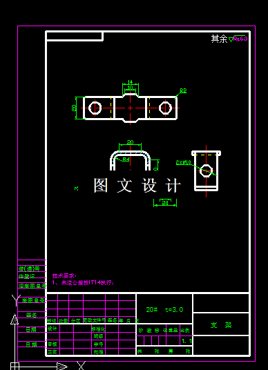 支架落料冲孔,弯曲模具设计,包括两套装配图,零件图,设计计算。 弯曲件厚度为3.0mm,因为成型弯曲件需要经过落料、冲孔、弯曲,才能最后实现产品型,由于产品形状简单,弯曲高度也小,所以不需要单独计算弯曲系数及尺寸分析,展开尺寸需要根据实际弯曲模具的间隙和模具结构来调试,计算结果仅仅作为参考。
