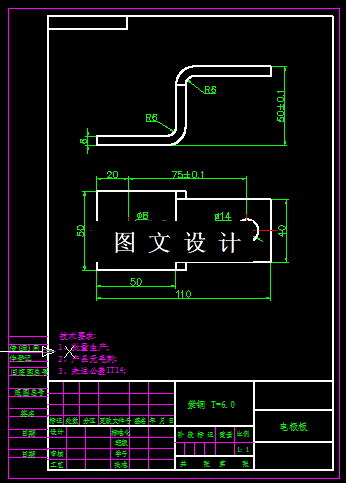 电极板落料冲孔弯曲模具设计,包括两套装配图,零件图,设计计算。 落料,弯曲共两种工序,具体如何安排需要详细斟酌考虑,尤其是弯曲工序,弯曲台阶尺寸公差0.2mm,如何保证这个公差,这和工序的数量和具体结构有关。此类产品简单的方法就是弯曲,最后成产品形状,在设计模具时需要考虑产品的回弹,在设计模具时如何避免回弹。