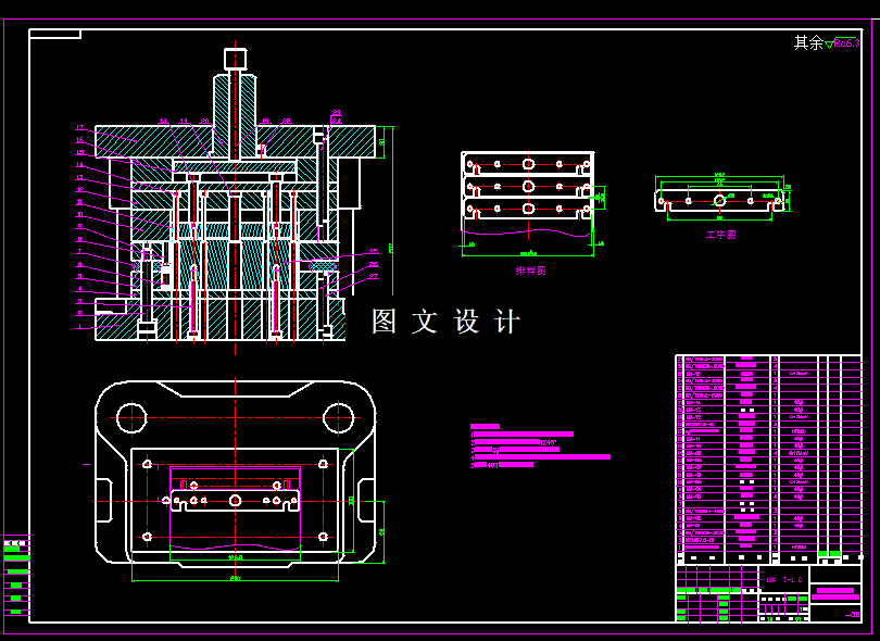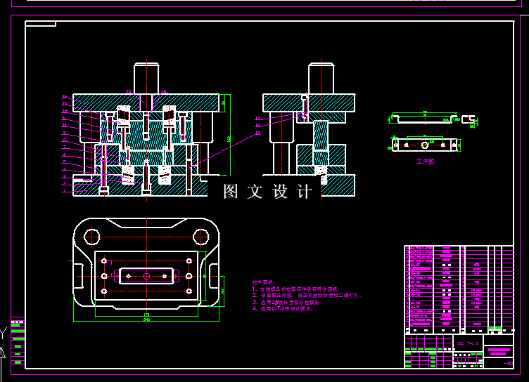 包装机用固定板模具设计,包括模具装配图,零件图,设计计算。 包装机用固定板厚度为1.0mm,因为该产品需要经过落料、冲孔、两次弯曲,才能最后实现产品型,由于产品形状简单,弯曲高度小,所以不需要单独计算弯曲系数及尺寸分析,展开尺寸需要根据实际弯曲模具的间隙和模具结构来调试。