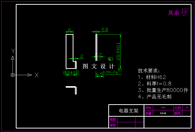 电器支架模具设计,包括落料冲孔,弯曲模设计,两套装配图,零件图,设计计算。 本零件是大批量生产件,用冲压加工方法由于生产效率高和材料利用率高,可以取得较好的经济效益。由电器支架零件图可知,该零件为一般的弯曲结构件,形状比较简单,无凹陷或其他形状突变,尺寸比较小,弯曲部分左右完全对称,冲压时受力较均匀。其尺寸精度、各处的圆角半径均符合弯曲工艺要求。因此要注意保证平面度和折弯角度垂直。