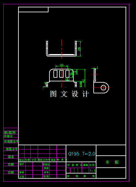 卡板落料冲孔弯曲模,包括两套装配图,零件图,设计计算。 本零件是大批量生产件,用冲压加工方法由于生产效率高和材料利用率高,可以取得较好的经济效益。由弯曲件零件图可知,该零件为一般的弯曲件,形状比较简单,无凹陷或其他形状突变,尺寸比较小,而且左右完全对称,冲压时受力较均匀。其尺寸精度、各处的圆角半径均符合弯曲工艺要求。因此要注意保证平面度和折弯角度垂直。