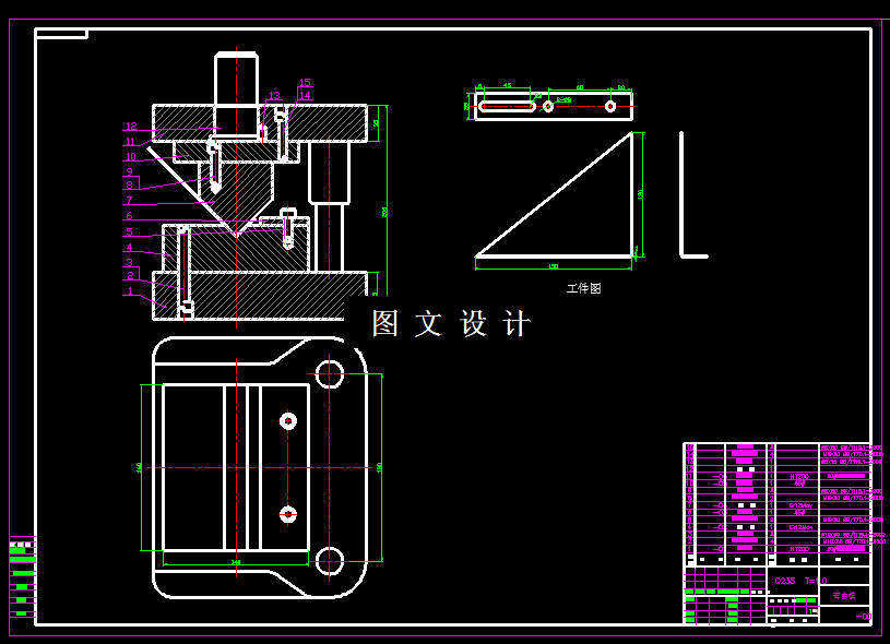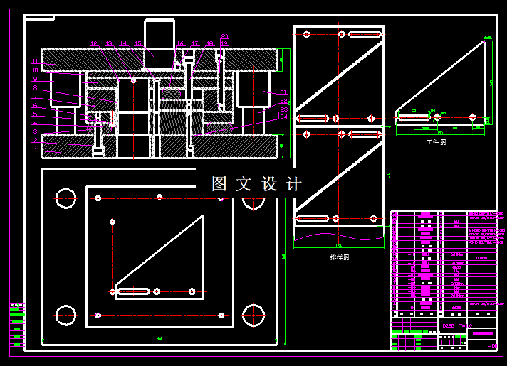 角架模具设计,包括落料冲孔模,弯曲模,两幅装配图,零件图,设计计算。 落料搭边值要合理确定,值过大,材料利用率低;值过小,搭边的强度与刚度不够,冲裁时容易翘曲或被拉断,不仅会增大冲裁件毛刺,有时甚至单边拉入模具间隙,造成冲裁力不均,损坏模具刃口。因此,搭边的最小宽度大于塑性变形区的宽度,一般可取等于材料的厚度。