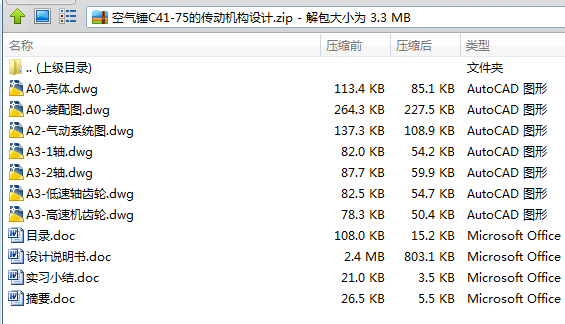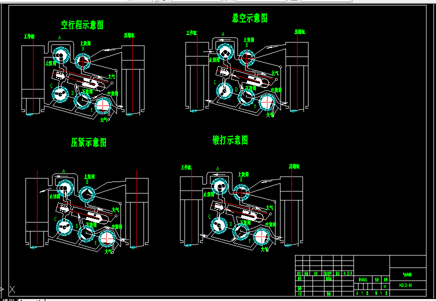 本设计主要是空气锤C41—75的传动机构设计,包括电动机的选取,带传动的结构设计与强度校核,齿轮传动的结构设计与强度校核,曲柄连杆机构传动结构设计,气传动的结构设计,以及各部分的润滑,电气控制以及密封处理。通过对各部分的设计和强度校核达到设计目的。