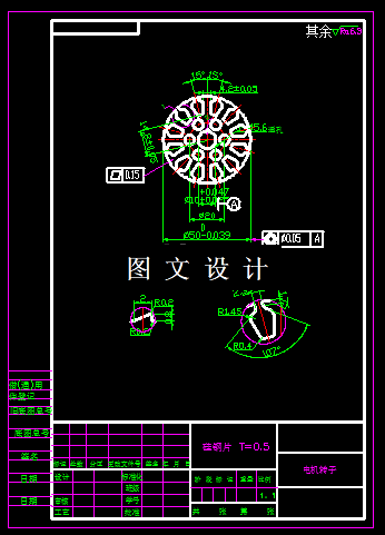 电机转子落料冲孔复合模设计,包括装配图,零件图,设计计算。 间隙是影响模具寿命的各种因素中占最主要的一个。冲裁过程中,凸模与被冲的孔之间,凹模与落料件之间的均有磨檫,而且间隙越小,磨檫越严重。在实际生产中受到制造误差和装配精度的限制,凸模不可能绝对垂直于凹模平面,而且间隙也不会绝对均匀分布,合理的间隙均可使凸模、凹模侧面与材料间的磨檫减小,并缓减间隙不均匀的不利影响,从而提高模具的使用寿命。