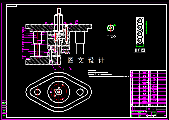 同心圆垫圈复合模具设计,包括装配图,零件图,设计计算,工艺设计。 对工序的安排,拟有以下几种方案: ①落料— 冲孔,单工序模生产。 ②落料—冲孔复合冲压,复合模生产。 ③冲孔—落料连续冲压,采用级进模生产。 综上所述,根据生产效率、精度、所使用的机床、卸料方式、废料出料、板料的定位方式、制造成本等方面分析最终确定方案②