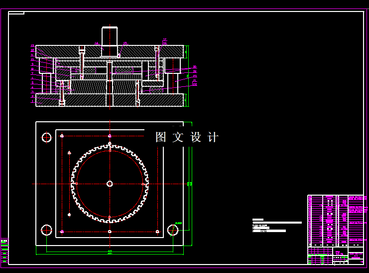 小孔锯片落料冲孔复合模具设计,包括装配图,零件图,设计计算。 本次产品所选材料为50#钢,该材料具有较高的强度和较好的冲压加工性能;该零件形状简单,但对孔边距接近凸凹模所允许的最小壁厚,如零件图所示,故可以考虑采用积存废料的复合冲压工序。
