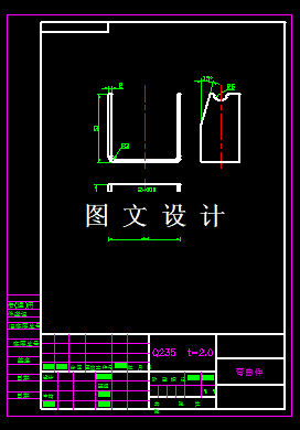 U弯曲件落料冲孔模设计,包括装配图,零件图,设计计算。 由于零件材料较厚,尺寸较小,冲裁间隙较大,采用复合模加工,可以选择后侧两导柱的标准模架,考虑零件精度要求不是很高,冲裁间隙较小,因此采用Ⅰ级模架精度。