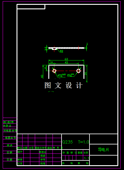 导电片翻孔模具设计,包括装配图,零件图,设计计算。 该零件材料为Q235钢,厚度1.0mm,年产量10万件。此材料为普通碳素钢,抗剪强度310-380MPa,抗拉强度,440-470 MPa。