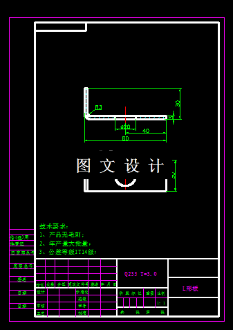 L形板弯曲模具设计,包括装配图,零件图,设计计算。 由L形板零件图可知,该零件为一般的弯曲结构件,形状比较简单,无凹陷或其他形状突变,尺寸比较小,弯曲部分左右完全对称,冲压时受力较均匀。其尺寸精度、各处的圆角半径均符合弯曲工艺要求。因此要注意保证平面度和折弯角度垂直。
