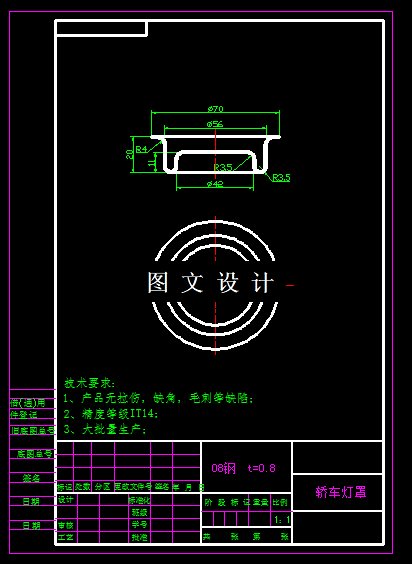轿车转向灯灯罩多工序冲压模具设计,包括装配图,非标零件图,设计计算。 该工件为带凸缘形拉深件,拉深高度不大,中间部分为反拉伸,预计一次拉深能够实现,不过具体拉深系数需要经过计算得出结果