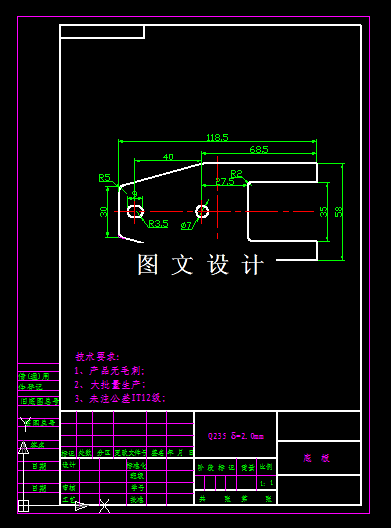 底板冲裁模具设计,包括装配图,零件图,设计计算。 此制件的形状较简单,但有两个叫无圆角过渡,这样设计模具时,凹模热处理后加工时不容易开裂,为便于模具的加工和减少冲压时在尖角处开裂的现象,同时也可以防止尖角部位刃口的过快磨损。这里需要增加R角过渡,本次设计根据材料厚度2.0mm,建议增加R1。