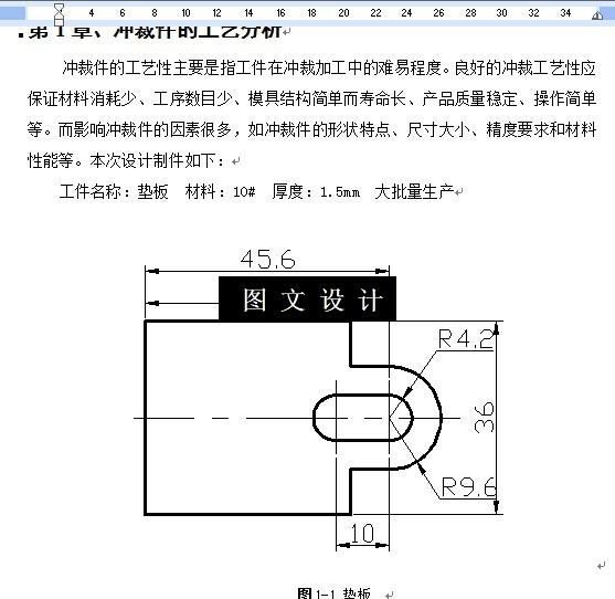 垫板落料冲孔复合模设计,包括装配图,零件图,设计计算。 工件结构形状相对简单,有1个长腰孔,孔与边缘之间的距离满足要求,料厚为1.5mm满足许用壁厚要求(孔与孔之间、孔与边缘之间的壁厚),可以冲裁加工。