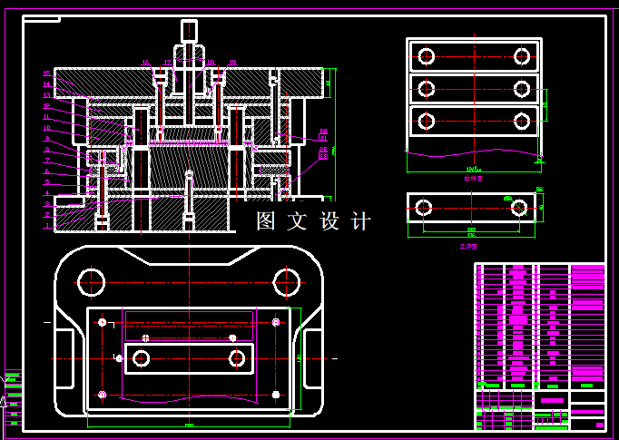后勾支架落料冲孔模具设计,包括装配图,非标零件图,设计计算。 该冲裁件包括落料和冲孔,弯曲三个基本工序,可采用的冲裁方案有单工序冲裁,复合冲裁和级进冲裁三种.零件属于中批量生产,因此采用单工序须要模具数量较多,生产率低,所用费用也高,不合理;若采用复合冲,可以得出冲件的精度和平直度较好,生产率较高,模具强度也能保证;用级进模冲裁时,生产率高,操作方便,但模具加工成本高,维修不方便,通过以上比较,选择复合模的冲裁工艺方案,即落料冲孔复合模,弯曲模。两幅。本次只设计落料冲孔模。