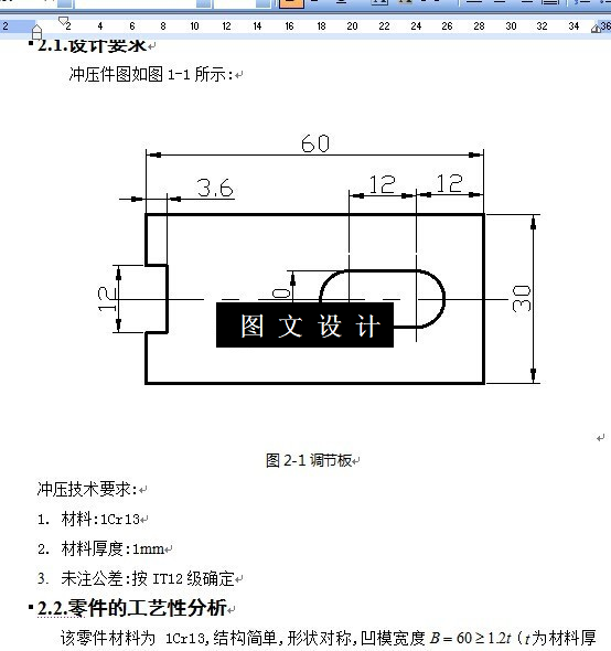 光缆报警系统调节板工艺与落料冲孔复合模具设计,包括装配图,非标零件,设计计算。 该零件材料为1Cr13,结构简单,形状对称,凹模宽度 ( 为材料厚度),因受凸模强度的限制,孔的尺寸不应太小,冲孔的最小尺寸取决于材料性能,凸模的强度和模具结构等。