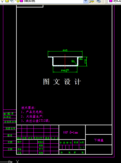 CAD-下端盖落料拉伸复合模设计,包括装配图,非标零件图,设计计算。 产品所用的材料为08F钢。属于优质碳素结构钢,其力学性能如下:τ=260~380Mpa,σb=300~400Mpa,σs=210Mpa。(《冷冲压工艺与模具设计》P322),零件图上未注公差等级,属自由尺寸,按IT12级确定工件尺寸的公差.该制件形状简单,尺寸较小,厚度一般,属于普通冲压件,