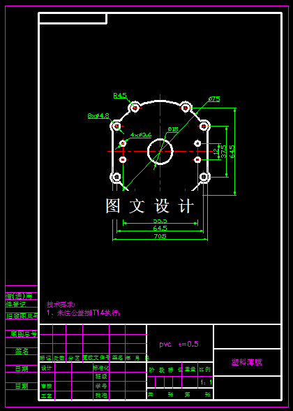 CAD-塑料薄膜冲压模具设计,包括装配图,零件图,设计计算。 零件形状简单,适用模具批量生产,零件材料PVC塑料薄膜,厚度t=0.5mm,产品材料性能分析如下: 材料材质:PVC,也称聚氯乙烯 抗剪强度(抗弯强度):70-80Mpa 抗拉强度:100-130Mpa