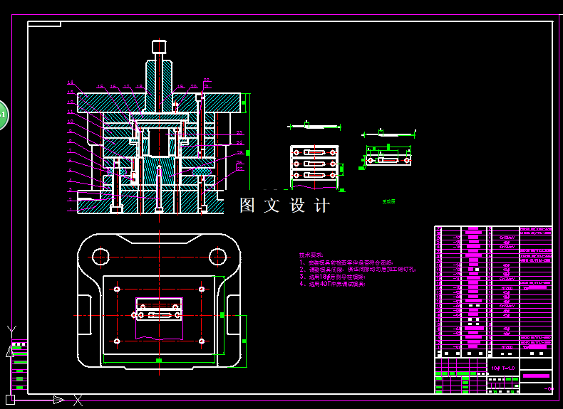 CAD-连接件落料冲孔倒装复合模设计,装配图,2张非标零件图,设计计算。 本设计通过对连接板的复合模设计的工艺性分析,确定了正确的工艺方案。从而对模具设计方案,以及冲压设备作出了分析与选择。通过分析决定采用复合模形式,然后参考其他模具结构以及查手册和计算设计。当所有的参数计算完后,对模具的装配方案,对主要零件的设计和装配要求技术要求都进行了分析。同时设计模具装配图,非标准零件的零件图。