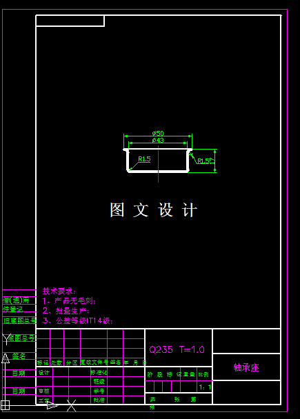 CAD-轴承座落料拉伸复合模具设计,包括装配图,3张非标零件图,设计计算 冲压工艺的选择是在查阅了相关资料和对产品外形成尺寸进行了仔细分析的基础上制定出来的;冲压模具的设计综合考虑了经济性、零件的冲压工艺性和复杂程度等诸多因素;产品毛坯的展开尺寸计算是在方便计算又不影响零件成型的前提下转化为熟悉的模型进行的。模具的主要部分零件给出了相应的尺寸计算,同时给出了详细的零件结构设计,并附有相应的零件图,最后根据零件结构设计和生产零件的要求生成了总装配图。