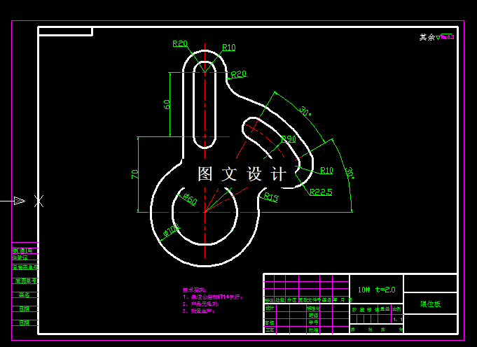 PROE-限位板落料冲孔倒装复合模具设计,包括装配图,非标零件图,3D立体图。 由限位板零件图可知,该零件为一般的冲裁结构件,形状比较简单,无凹陷或其他形状突变,尺寸比较小,无尖角。其尺寸精度、各处的圆角半径均符合冲裁工艺要求。